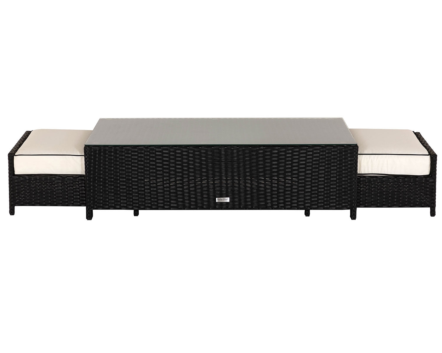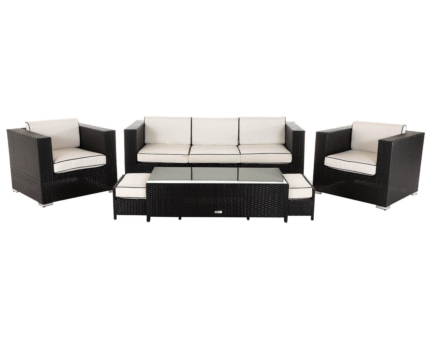 - Set includes – 1x 3-seater Ascot sofa in black and vanilla, 2x Ascot armchairs in black and vanilla, 2x cushioned footstools in black and vanilla, 1x large rectangular tempered glass coffee table in black, and FREE outdoor covers.