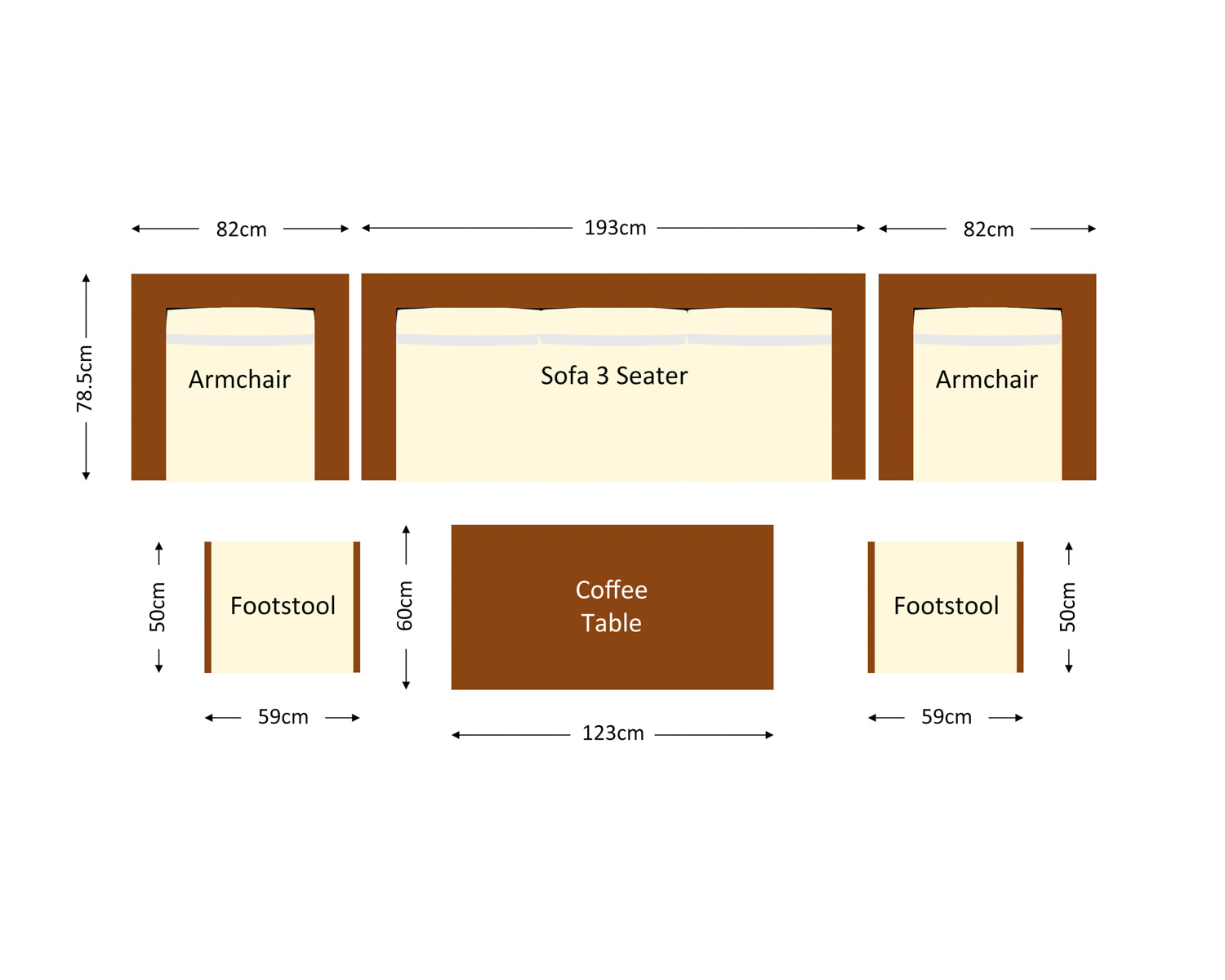Set includes - 1x 3-seater Ascot sofa in chocolate and cream, 2x Ascot armchairs in chocolate and cream, 2x cushioned footstools in chocolate and cream, 1x large rectangular tempered glass coffee table in chocolate, and FREE outdoor covers.