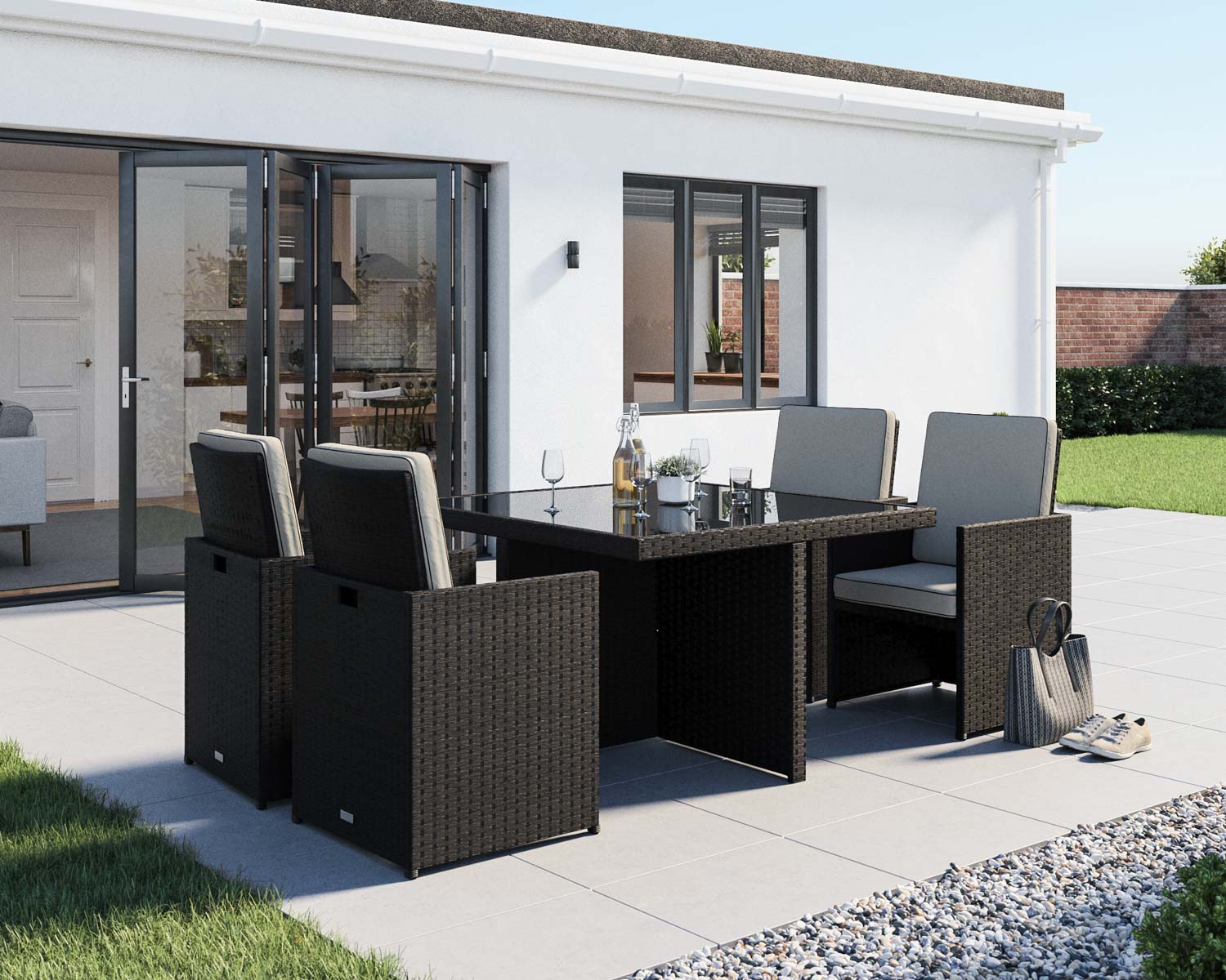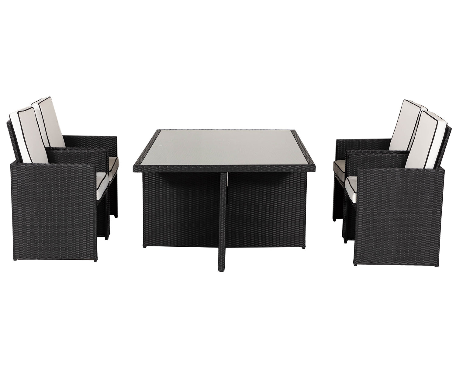 Elevate your outdoor entertaining with the Barcelona 4-seater cube set in black and vanilla. This "must-have" contemporary design is perfect for small families who value both style and clever space-saving engineering. The set features four cushioned chairs with full lumbar support and decorative piped edging, all of which tuck neatly and completely beneath the large rectangular dining table when not in use. The striking black and vanilla colour combination brings a sophisticated, high-end aesthetic to your garden, while the compact footprint ensures your patio remains tidy and spacious—making this the ultimate solution for stylish outdoor entertaining.