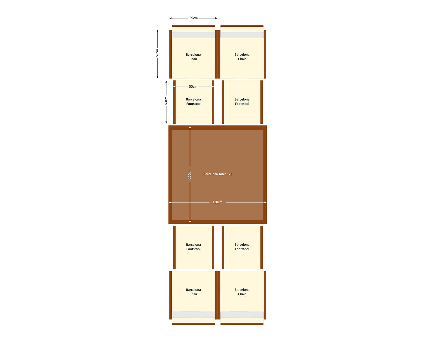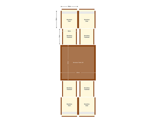 - Set includes - 4x Barcelona dining chairs in chocolate mix and cream, 4x cushioned footstools in chocolate mix and cream, 1x large rectangular tempered glass dining table in chocolate, and FREE outdoor covers.