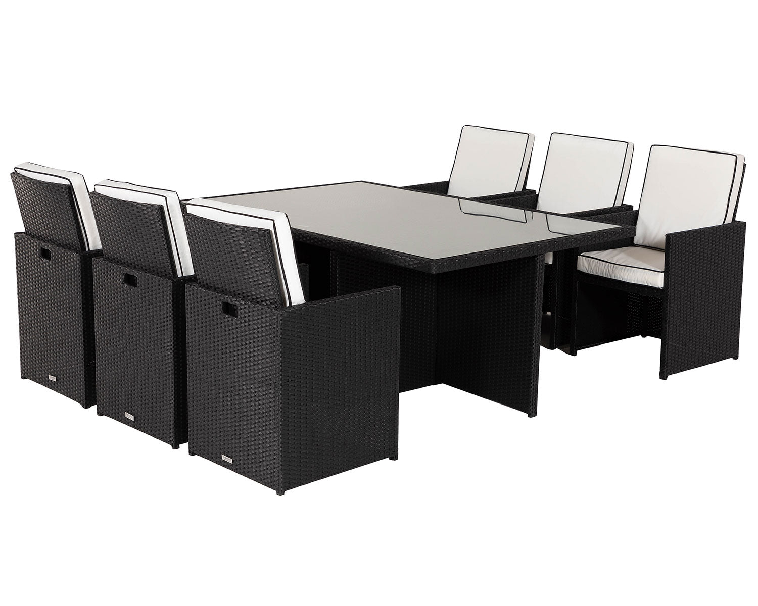 - Set includes - 6x Barcelona dining chairs in black and vanilla, 1x large rectangular tempered glass dining table in black, and FREE outdoor cover.