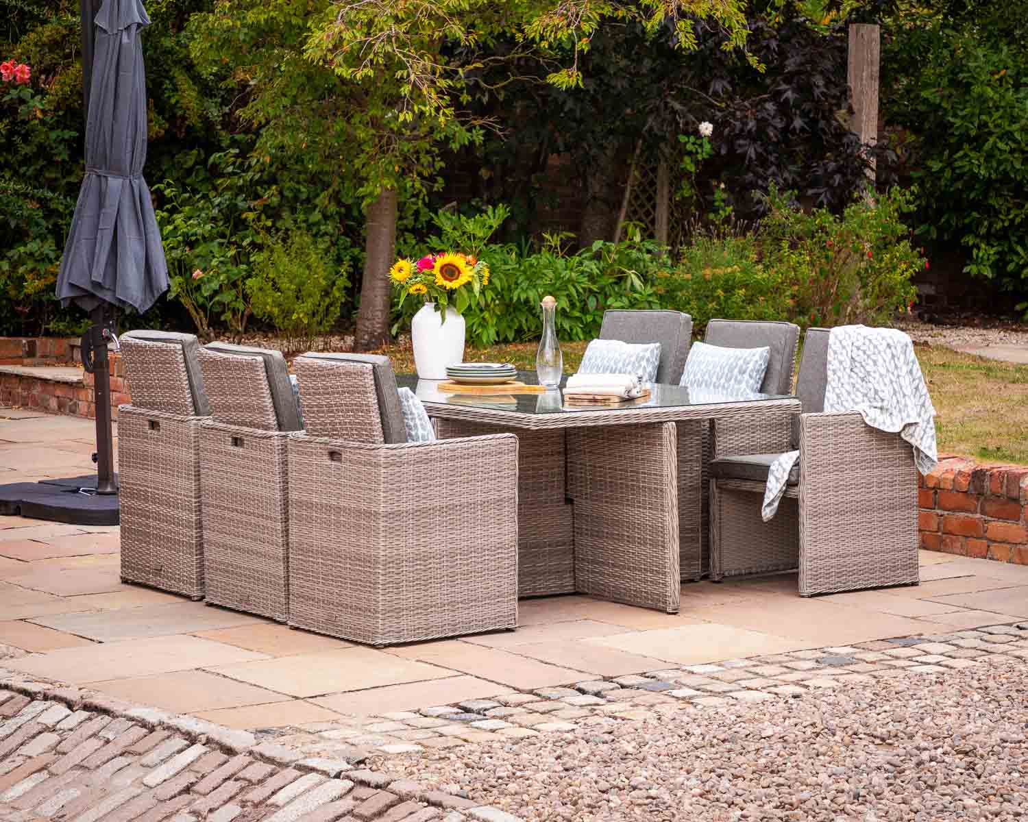 Be the ultimate host this summer with the Barcelona 6-seater cube set in grey. This sophisticated collection brings a touch of class to your outdoor entertaining, featuring six thoughtfully designed chairs with thick cushions that fold neatly beneath the table when not in use. The spacious large rectangular dining table provides the perfect setting for family feasts and summer gatherings, while the contemporary grey aesthetic ensures this set complements any garden style. With its clever space-saving design and durable construction, Barcelona is the ideal choice for those who want to maximise entertaining without compromising on style or comfort.