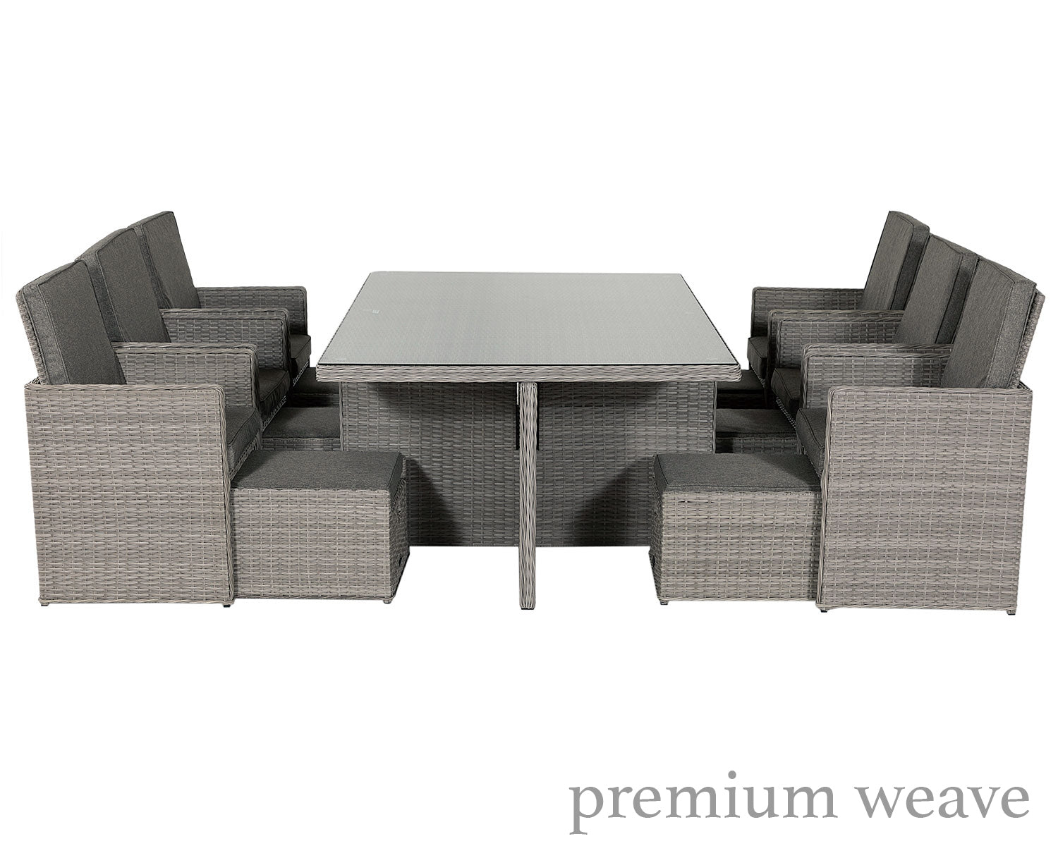 Entertaining guests outdoors has never been easier with the Barcelona 6-seater cube set with footstools in grey. This compact, thoughtfully designed collection is a masterclass in space-saving luxury, featuring six armchair-like chairs and six matching cushioned footstools that all tuck neatly away beneath the table. The contemporary grey weave creates a modern, versatile aesthetic that complements any garden or patio. Whether you're hosting a full dinner party or stretching out with your feet up on a cushioned footstool, this innovative set offers the ultimate in comfort and practicality for your outdoor lifestyle.