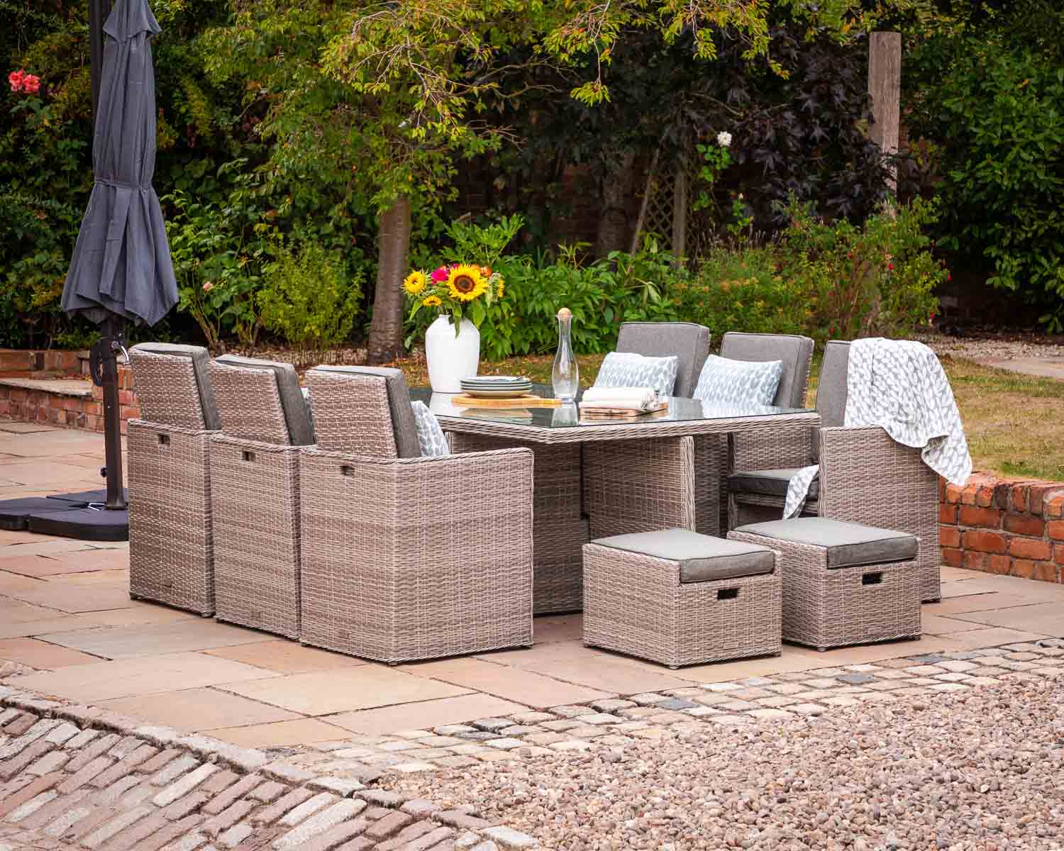 The Barcelona 6-seater cube set with footstools in grey is the perfect choice for those who want the luxury of a full lounging suite without sacrificing space. We love how the footstools elevate the comfort experience, allowing you to stretch out and truly relax between courses or after dinner, while also serving as extra seating for unexpected guests. The contemporary grey weave is modern and versatile, fitting seamlessly into any garden aesthetic. Built with a rust-resistant frame and supplied with free protective covers, this set is a smart, stylish, and durable investment for many summers of effortless outdoor entertaining and relaxation.
