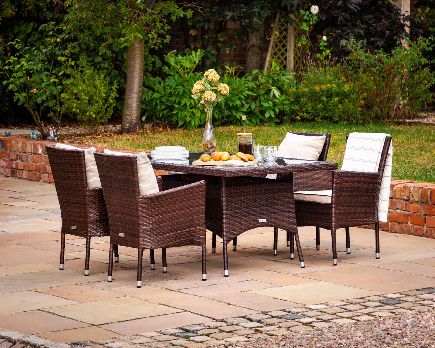Cambridge 4 rattan garden chairs and small rectangular dining table set in chocolate and cream Fabrics