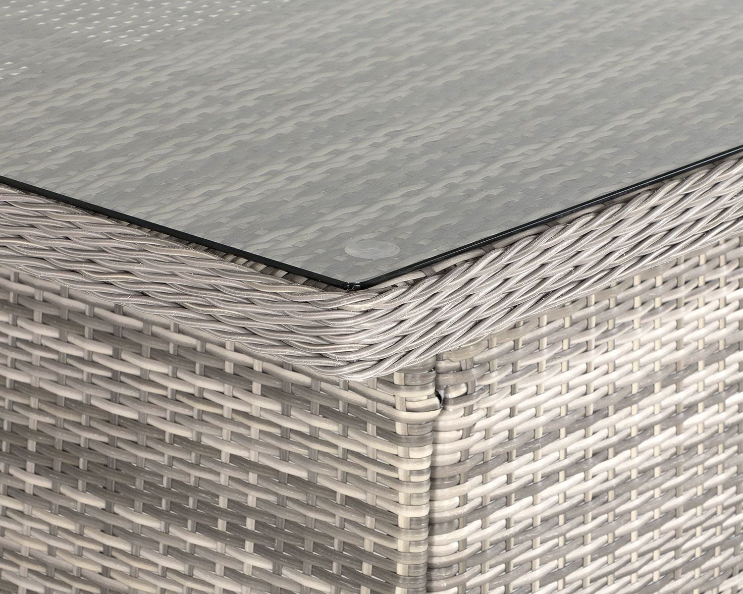 - Finish/material - Hand-woven synthetic rattan weave in grey with lightweight aluminium frame; tempered glass tabletop.
