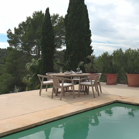 The Shiro six-seater dining set is a sophisticated ensemble, featuring a stylish 160cm round table in light wood that serves as a striking focal point for any garden. This elegant piece is perfectly paired with matching Shiro chairs, offering both comfortable seating and a seamless, contemporary aesthetic.