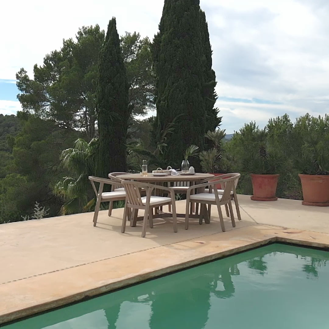 Ideal for family mealtimes or hosting outdoor gatherings, the set effortlessly blends form and function, with the natural charm of acacia wood elevating your alfresco dining experience.